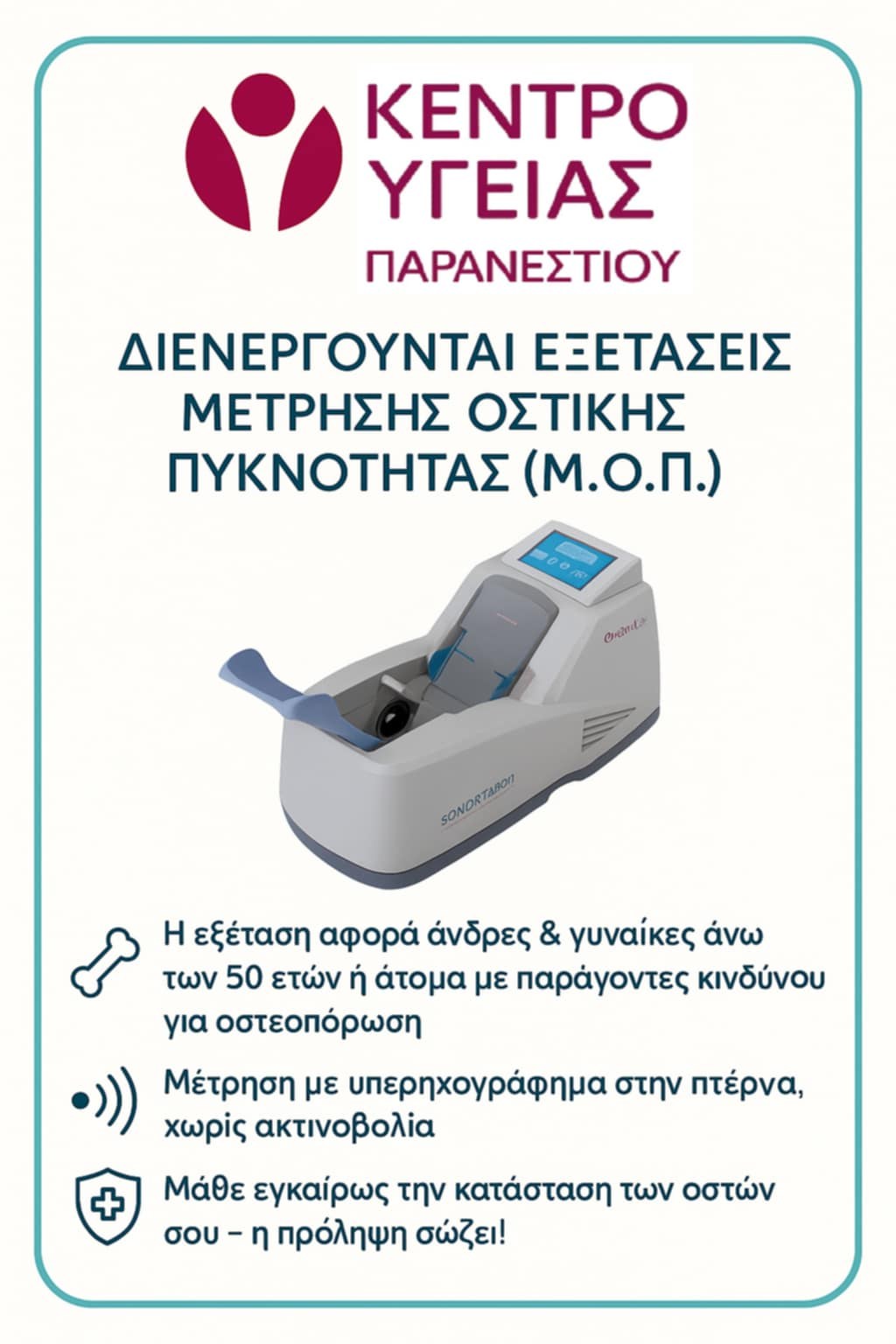 Το Κέντρο Υγείας Παρανεστίου αποτελεί βασική δομή πρωτοβάθμιας φροντίδας υγείας για τον Δήμο Παρανεστίου και τους γύρω οικισμούς. Με στόχο την έγκαιρη διάγνωση, την πρόληψη και την αντιμετώπιση προβλημάτων υγείας, προσφέρει ολοκληρωμένες ιατρικές και νοσηλευτικές υπηρεσίες σε καθημερινή βάση, καλύπτοντας τις ανάγκες των κατοίκων και των επισκεπτών της περιοχής.